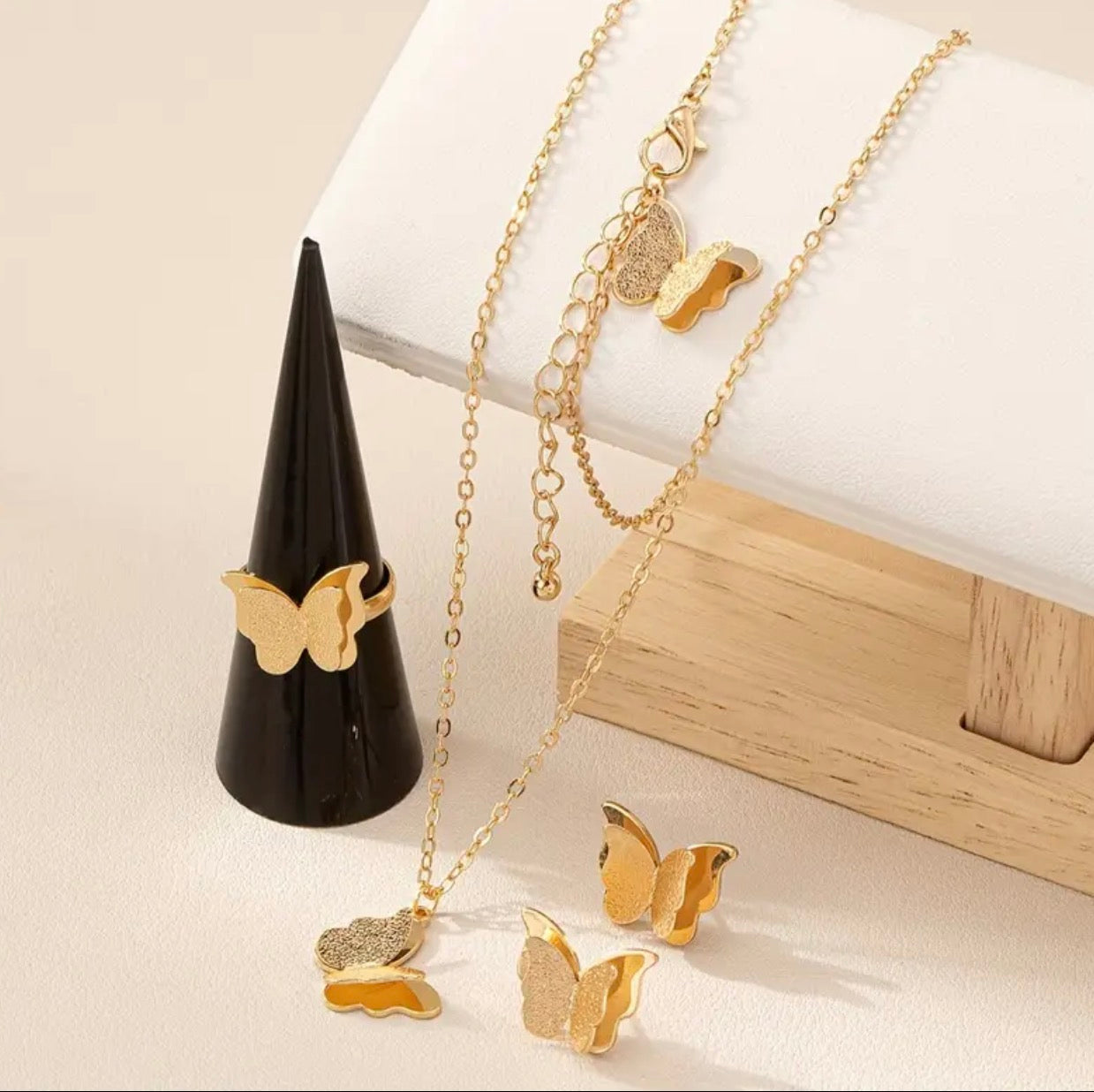 Discover elegance and versatility with the Butterfly Bliss Complete Set by AdornMe. Expertly crafted for women, this set features high-quality stainless steel construction, perfect for both casual and formal occasions. Upgrade your accessories today with this must-have set! Includes bracelet, necklace, ring, and earrings.